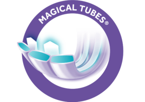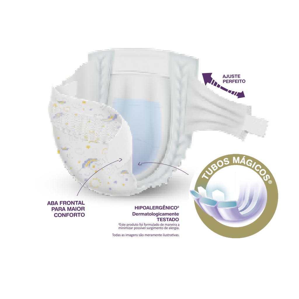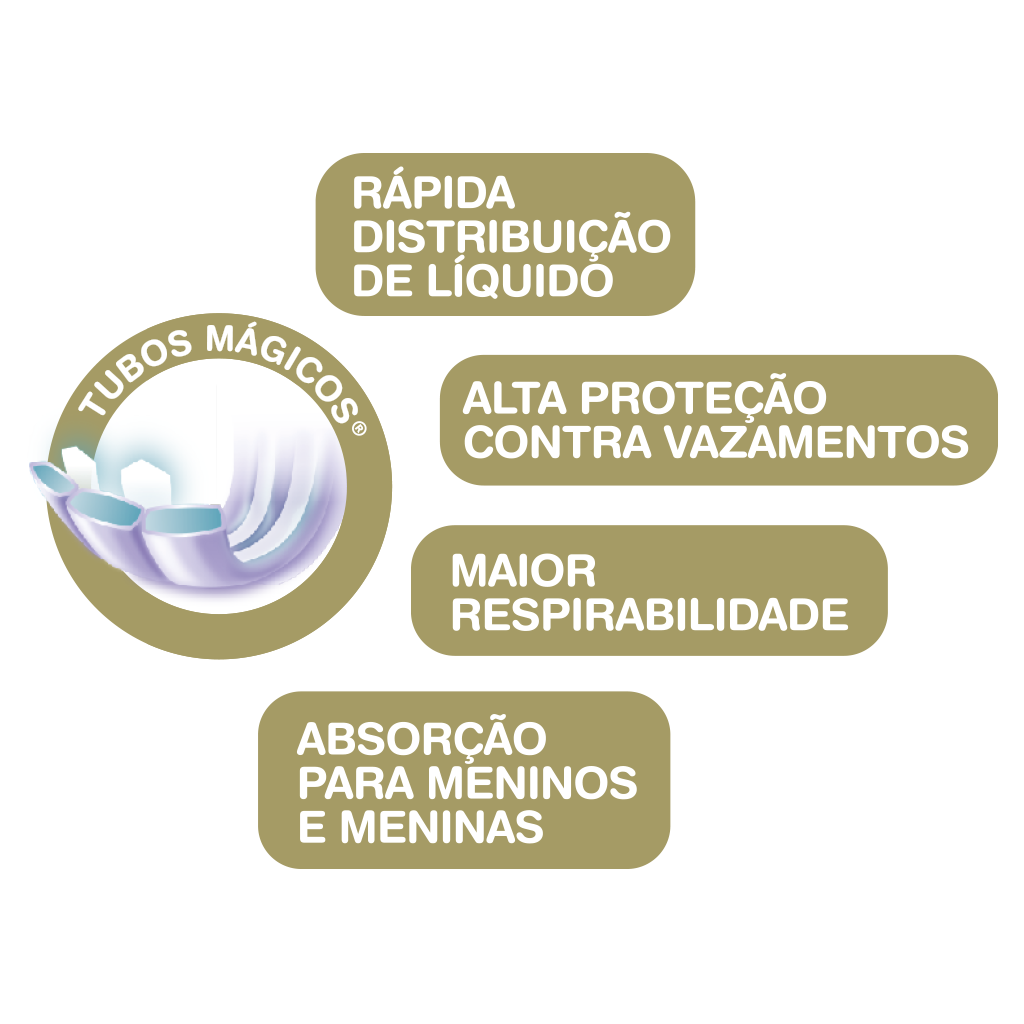 Tecnologia de canal patenteada projetada para distribuir uniformemente o líquido ao redor da fralda e evitar a flacidez.